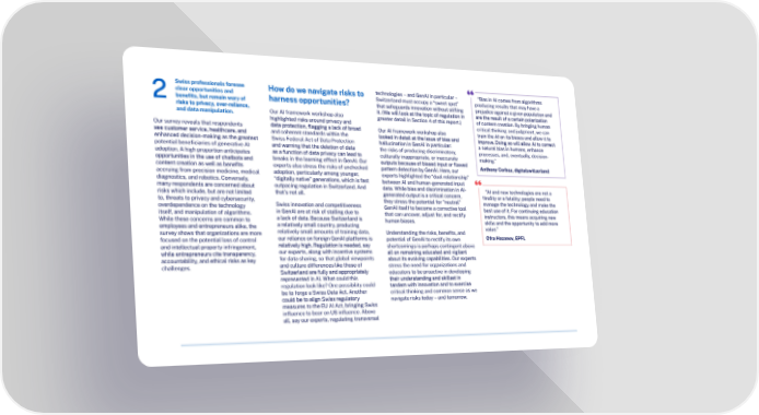 Swiss professionals foresee How do we navigate risks to technologies – and GenAI in particular – “Bias in AI comes from algorithms clear opportunities and harness opportunities? Switzerland must occupy a “sweet spot” producing results that may have a 2 bene昀椀ts, but remain wary of that safeguards innovation without sti昀氀ing prejudice against a given population and risks to privacy, over-reliance, Our AI framework workshop also it. (We will look at the topic of regulation in are the result of a certain polarization and data manipulation. highlighted risks around privacy and greater detail in Section 4 of this report.) of content creation. By bringing human critical thinking and judgment, we can Our survey reveals that respondents data protection, 昀氀agging a lack of broad Our AI framework workshop also train the AI on its biases and allow it to see customer service, healthcare, and and coherent standards within the looked in detail at the issue of bias and improve. Doing so will allow AI to correct enhanced decision-making as the greatest Swiss Federal Act of Data Protection hallucination in GenAI in particular: a natural bias in humans, enhance potential bene昀椀ciaries of generative AI and warning that the deletion of data the risks of producing discriminatory, processes, and, eventually, decision- adoption. A high proportion anticipates as a function of data privacy can lead to culturally inappropriate, or inaccurate making.” opportunities in the use of chatbots and breaks in the learning effect in GenAI. Our outputs because of biased input or 昀氀awed content creation as well as bene昀椀ts experts also stress the risks of unchecked pattern detection by GenAI. Here, our Anthony Corbaz, digitalswitzerland accruing from precision medicine, medical adoption, particularly among younger, experts highlighted the “dual relationship” diagnostics, and robotics. Conversely, “digitally native” generations, which is fast between AI and human-generated input many respondents are concerned about outpacing regulation in Switzerland. And data. While bias and discrimination in AI- “AI and new technologies are not a risks which include, but are not limited that’s not all. generated output is a critical concern, to, threats to privacy and cybersecurity, they stress the potential for “neutral” 昀椀nality or a fatality; people need to overdependence on the technology Swiss innovation and competitiveness GenAI itself to become a corrective tool manage the technology and make the itself, and manipulation of algorithms. in GenAI are at risk of stalling due to that can uncover, adjust for, and rectify best use of it. For continuing education While these concerns are common to a lack of data. Because Switzerland is human biases. instructors, this means acquiring new employees and entrepreneurs alike, the a relatively small country, producing skills and the opportunity to add more relatively small amounts of training data, value.” survey shows that organizations are more Understanding the risks, bene昀椀ts, and focused on the potential loss of control our reliance on foreign GenAI platforms is potential of GenAI to rectify its own Ofra Hazanov, EPFL and intellectual property infringement, relatively high. Regulation is needed, say shortcomings is perhaps contingent above while entrepreneurs cite transparency, our experts, along with incentive systems all on remaining educated and vigilant accountability, and ethical risks as key for data sharing, so that global viewpoints about its evolving capabilities. Our experts challenges. and culture differences like those of stress the need for organizations and Switzerland are fully and appropriately educators to be proactive in developing represented in AI. What could this their understanding and skillset in regulation look like? One possibility could tandem with innovation and to exercise be to forge a Swiss Data Act. Another critical thinking and common sense as we could be to align Swiss regulatory navigate risks today – and tomorrow. measures to the EU AI Act, bringing Swiss in昀氀uence to bear on US in昀氀uence. Above all, say our experts, regulating transversal