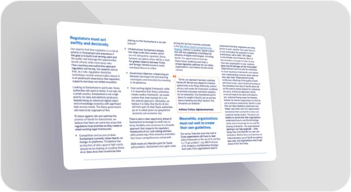 Regulators must act sharing so that Switzerland is not left among the top 昀椀ve countries worldwide understand that their employees are using swiftly and decisively. behind? in the IMD World Digital Competitiveness GenAI at work, whether they want them to Ranking, making it a leading “digital nation;” or not. Unchecked the potential for harm • Infrastructure: Switzerland already one with the capabilities to facilitate full is enormous, warns Joshi. “All it takes Our experts 昀椀nd that regulation is a critical has large scale data centers which adoption of digital technologies, including is one mistake, one erroneous, false, or priority in Switzerland and elsewhere if are not adequately regulated. Going GenAI. The opportunity to leverage discriminatory message to make its way the goal is to build trust among users and forward, we believe there will be a need Swiss future-readiness and forge a from your organization to your customer the public and leverage the opportunities for greater balance between Swiss unique regulatory pathway for our nation, base, and the damage can be incalculable.” GenAI affords while minimizing risks. and foreign infrastructure to avoid organizations, and citizens should not be Organizations must not wait for authorities How countries and authorities approach overdependence on either. missed. to issue regulatory frameworks and instead regulation will be key. Our experts concur start implementing common-sense policies that, as a rule, regulation should be • Government dilemma: a balancing act now, says Joshi. These should include technology-neutral and principles-based. It between securing trust and ensuring “So far, our approach has been relatively continuous checking of the quality of data is of paramount importance that regulation sovereignty and innovation by investing hands-off. We are now ahead of a massive and broad-scale, cross-functional training on supports and does not inhibit innovation. in AI platforms. opportunity to do things differently: protect the limitations and risks of GenAI; above all, Looking at Switzerland in particular, Swiss • Over-arching digital framework: while privacy and create the framework conditions on the need to check outputs for coherence, authorities will need to factor in our size. As it is imperative that Swiss authorities to promote innovation and foster adoption accuracy, and brand alignment. GenAI a small country, Switzerland is not a high create a policy framework, we would by our population. Can Switzerland punch is not yet ready to be used unchecked in priority for data and platform producers, caution that state-backed AI is not above its weight in GenAI, just as we have any customer-facing sense, he stresses. despite being an advanced digital nation the optimal approach. Ultimately, we done in banking and other sectors? This Instead, he advises organizations to limit its believe it is likely that the EU AI Act should be our ambition.” use to enhance productivity. GenAI is a tool and a knowledge economy with signi昀椀cant that can help marketers experiment and data access needs. The Swiss government will form part of what Swiss authorities Anthony Corbaz, digitalswitzerland ideate, says Joshi, and not a replacement will need to be cognizant of this. go on to adopt given our geopolitical mechanism that can be left to churn out proximity and economic ties. customer-facing content. The onus is on To brace against risk and optimize the leaders to ensure that their organizations promise of GenAI for Switzerland, we There is also a clear opportunity ahead of Meanwhile, organizations understand how to use this technology believe that there are some key areas that Switzerland to leverage its small size; to must not wait to create safely and to encourage its use and the regulators must prioritize as they create or bring 昀氀exibility and consensus to a bespoke adapt existing legal frameworks: approach that respects the regulatory their own guidelines. sharing of bene昀椀ts – the organizational frameworks of our core trading partners, learning it can help engender – while Competition and access to data: being clear and emphatic on rules and • while preserving a free economy orientation Our survey 昀椀nds that more than half of limitations. Neither knee-jerk banning nor Switzerland currently relies heavily on that favors competitiveness and growth. Swiss organizations still have no clear indiscriminatory use of GenAI are options, foreign AI platforms. To balance low policy framework on the use of AI, and this says Joshi, and organizations need to get production of data against high needs, 2024 marks an in昀氀ection point for Swiss is a “huge problem,” says IMD Professor ahead of this fact today. should we be looking at creating Swiss policymakers. Switzerland once again ranks of AI, Analytics, and Marketing Strategy AI or Data Acts that incentivize data Amit Joshi. First, organizations need to