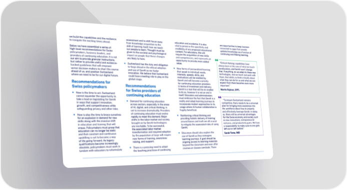 we build the capabilities and the resilience assessment and to shift focus away education and academia. It is also are opportunities to keep learners to navigate the exciting times ahead. from knowledge acquisition to the vital to preserve the speci昀椀city and connected to apps that provide skill of learning itself: how we teach credibility of any proposed educational updated knowledge as a function of Below we have assembled a series of our people to learn. Thought must be content. For educators, this will continuing and lifelong learning. high-level recommendations for Swiss given to the societal and psychological require the acquisition of new skills policymakers, business leaders, and impact on people that these changes and competencies, and represents an providers of continuing education. It is not are likely to have. opportunity to provide more added “Critical thinking capabilities have our aim to provide granular instructions, value. always been at the core of what we teach but rather to provide useful and evidence- • Switzerland has the duty and obligation as educators, and GenAI won’t change backed guidelines that will empower to forge ahead in the ethical adoption • New forms of personalized learning that. If anything, as we adapt to these new senior decision-makers to chart the course and use of GenAI as we foster that speak to individual needs, technologies, and we teach and work with ahead of us, and position Switzerland innovation. We believe that Switzerland interests, speeds, skills, and them, that ability to think critically about where we need to be for our digital future. could have a leading role to play on the motivations will be enabled by what they can do for us and what we can global stage. GenAI and will become a priority expect from them becomes even more Recommendations for for continuing education providers important.” Recommendations in terms of investment and delivery. Swiss policymakers for Swiss providers of GenAI is a tool that will be an enabler Martin Rajman, EPFL • Now is the time to act. Switzerland to do so, however it is not an end in cannot squander the opportunity to continuing education itself. Educators and administrators take a lead on legislating for GenAI must embrace the fact that GenAI is a “To ensure Switzerland remains in ways that support innovation, • Demand for continuing education reality and adapt learning journeys to competitive, there needs to be a universal growth, and competitiveness while across sectors, especially in the areas incorporate modern approaches to its plan for bringing more awareness into safeguarding privacy and other risks. of AI, digital, and critical thinking, is usage where AI-human collaboration is the workforce about how to properly set to increase dramatically. Providers hugely bene昀椀cial. and effectively leverage GenAI. In doing • Now is also the time to brace ourselves of continuing education must evolve • Reinforcing critical thinking and so, there will be universal advantages for an explosion in demand for new rapidly to meet this demand. Major providing holistic delivery of training for the Swiss economy and society such skills along with the massive shift shifts in the labor market and society around biases and truth are all crucial as new innovations, entrepreneurial in education and training that will brought on by GenAI technologies to mitigate the associated risks of using ventures, and productivity gains. We have ensue. Policymakers must grasp that are inevitable. To be successful, GenAI. a responsibility to make sure no one gets education can no longer be static the associated labor market left out or left behind.” and that constant and continuous transformation and required adoption • Educators should also explore the upskilling is set to become a way by the population at large will require use of GenAI as they reimagine Sarah Toms, IMD of life going forward. As legacy new forms of training, awareness learning journeys. A goal should be raising, and support. quali昀椀cations become increasingly ongoing access to learning materials obsolete, policymakers must work in • There is a pressing need to adapt beyond the classroom and even after tandem with educators to reformulate the teaching practices of continuing courses or classes conclude. There
