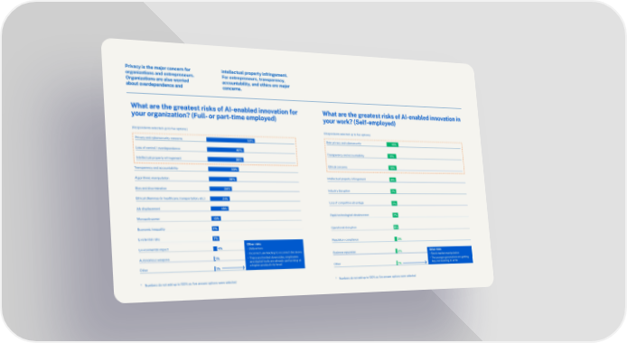Privacy is the major concern for intellectual property infringement. organizations and entrepreneurs. For entrepreneurs, transparency, Organizations are also worried accountability, and ethics are major about overdependence and concerns. What are the greatest risks of AI-enabled innovation for What are the greatest risks of AI-enabled innovation in your organization? (Full- or part-time employed) your work? (Self-employed) (Respondents selected up to five options.) (Respondents selected up to five options.) Privacy and cybersecurity concerns 53% Data privacy and cybersecurity 15% Loss of control / overdependence 40% Transparency and accountability 11% Intellectual property infringement 39% Ethical concerns 10% Transparency and accountability 33% Algorithmic manipulation 30% Intellectual property infringement 8% Bias and discrimination 24% Industry disruption 7% Ethical dilemmas (in healthcare, transportation, etc.) 21% Loss of competitive advantage 7% Job displacement 19% Monopoly power 10% Rapid technological obsolescence 7% Economic inequality 7% Operational disruption 6% Existential risks 7% Other risks Regulatory compliance 3% Environmental impact 4% • Data errors • Incorrect use leading to incorrect decisions Business reputation 2% Other risks Autonomous weapons 1% • There are limited downsides, employees • Stock market manipulation and digital tools are already performing at • The younger generations are getting Other 1% a higher productivity level Other 1% lazy, not learning to write * Numbers do not add up to 100% as five answer options were selected * Numbers do not add up to 100% as five answer options were selected
