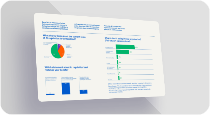 Some 34% or respondents believe self-regulation and government-imposed Meanwhile, 52% say that their that more AI regulation is required in policy. More than half of all respondents organizations currently have no clear Switzerland, though 71% would like to are ignorant about current Swiss policy. policy on AI. And it’s a problem. see a balance between organizational What Whdoayt odou thi yonk abou think about theut thecurren cut srrentatt se tate What isWh theat is AI pol the AI policy in icyyo iun r yorogur anizorgaaniztion? ation? of AI rof AI regulaetion igulation in Switn Szerlwitand?zerland? (Full-(F or ulpl-a or rt-ptiamert- empltime employed)oyed) Less AI reguLelastios AI rn egulation is required is required 1% 8% 1% 8% AI is being AI is being 52% 52% regulated regulated No AI policieNso AI polexist icies exist appropriatelappry opriately Limited useLi omitf AI ised use of AI is 35% 35% permitted permitted 57% 57% 34% 34% More AI More AI regulation isregulation is 4% 4% Don’t knowDon’t know required required Have clear AI polHave cicleyar AI policy 3% 3% Evolving Evolving WhicWhich stah stementatement abot aut AI rbout AI regulaetion begulation best st No format AI poNo forlicmy,a t AI policy, 2% 2% matcmheastc yhoeusr ybelouier belfs?iefs? but guidelinebut gs uidelines 1% 1% Use of AI isUse bannedof AI is banned OrganizatioOnsrg shoanizuald betions should be There shoulTherd bee a b shoaluancld bee a balance There shoulTherd bee mo shoreuld be more allowed to raleglouwlaed tte hoo rwegulate how between cobemptwaneen cy selof-rmpeganulya tioseln f-regulatiogon vernmengt oovvernmenersight t oversight 3% 3% AI is used themAI issel used themves selves and governmenand gt oovvernmenersight t oversight regarding thereg sarafdeing the use of AI safe use of AI Don’t knowDon’t know 71% 71% 34% or r3e4% sponor rdenesponts repordentt ths reporat mot threa AI rt moergeu AI rlatioen isgul ratioequn isired i requn Sirwited izn Serlanwitd.z erland. NeverthelNeevsers,thel 71% esos,f 7re1% spoondenf respots belndenietvse bel therieev shoe therulde be sho a ublda belanc a be bealanctween e between compancyo selmpfan-reyg selulaftion a-regulnd gation aovernmennd government oversit ghovt erin siAI rghet gin uAI rlatioen.gulation. 23% 23% 52% of fu52% ll/poarf fut till/pmear emplt timeoyempled reospoyed rndenesponts stdenatet ths satt theiate thr act theiompanier comps doanie sdo 6% 6% not haveno ct hlear AIave c polear AIlicy. policy.