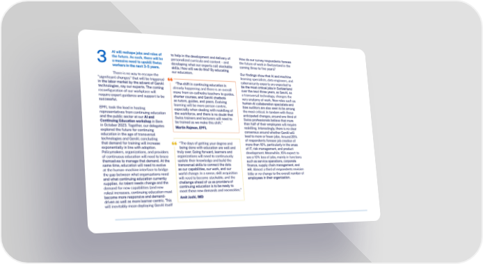 AI will reshape jobs and roles of to help in the development and delivery of How do our survey respondents foresee the future. As such, there will be personalized curricula and content – and the future of work in Switzerland in the 3 a massive need to upskill Swiss developing what our experts call stackable coming three to 昀椀ve years? workers in the next 3-5 years. skills. How will we do this? By educating our educators. Our 昀椀ndings show that AI and machine There is no way to escape the learning specialists, data engineers, and cybersecurity experts are expected to “signi昀椀cant changes” that will be triggered in the labor market by the advent of GenAI “The shift in continuing education is be the most critical jobs in Switzerland technologies, say our experts. The coming already happening and there is an overall over the next three years, as GenAI, as move from ex-cathedra teachers to guides, a transversal technology, changes the recon昀椀guration of our workplace will require expert guidance and support to be shorter courses, and GenAI chatbots very anatomy of work. New roles such as successful. as tutors, guides, and peers. Evolving human-AI collaboration specialists and learning will be more person-centric, bias auditors are also seen to be among EPFL took the lead in hosting especially when dealing with reskilling of the most critical. In tandem with these representatives from continuing education the workforce, and there is no doubt that anticipated changes, around one third of and the public sector at our AI and Swiss trainers and lecturers will need to Swiss professionals believe that more Continuing Education workshop in Bern be trained as we make this shift.” than half of their employees will require in October 2023. Together, our delegates Martin Rajman, EPFL reskilling. Interestingly, there is no clear explored the future for continuing consensus around whether GenAI will education in the age of transversal lead to more or fewer jobs. Around 20% technologies and GenAI, concluding of respondents foresee job creation of that demand for training will increase “The days of getting your degree and more than 10%, particularly in the areas exponentially in line with adoption. being done with education are well and of IT, risk management, and product Policymakers, organizations, and providers truly over. Going forward, learners and development. Meanwhile, 15% expect to of continuous education will need to brace organizations will need to continuously see a 10% loss of jobs, mainly in functions themselves to manage that demand. At the update their knowledge and build the such as service operations, corporate same time, education will need to evolve transversal skills to connect the dots at the human-machine interface to bridge as our capabilities, our work, and our 昀椀nance, supply chain management, and HR. Almost a third of respondents envision the gap between what organizations need world change. In a sense, skill acquisition little or no change to the overall number of and what continuing education currently will need to become stackable, and the employees in their organization. supplies. As talent needs change and the challenge ahead of us as providers of continuing education is to be ready to demand for new capabilities (and new meet these new demands and necessities.” roles) increases, continuing education must become more responsive and demand- driven as well as more learner-centric. This Amit Joshi, IMD will inevitably mean deploying GenAI itself