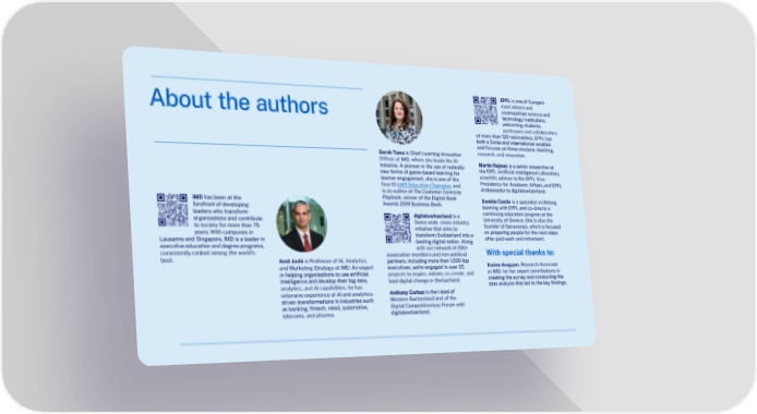 EPFL is one of Europe’s most vibrant and cosmopolitan science and About the authors technology institutions, welcoming students, professors and collaborators of more than 120 nationalities. EPFL has both a Swiss and international vocation and focuses on three missions: teaching, Sarah Toms is Chief Learning Innovation research, and innovation. Of昀椀cer at IMD, where she leads the AI Martin Rajman is a senior researcher at Initiative. A pioneer in the use of radically new forms of game-based learning for the EPFL Arti昀椀cial Intelligence Laboratory, learner engagement, she is one of the scienti昀椀c advisor to the EPFL Vice- 昀椀rst 10 AWS Education Champion, and Presidency for Academic Affairs, and EPFL is co-author of The Customer Centricity Ambassador to digitalswitzerland. IMD has been at the Playbook, winner of the Digital Book Danièle Castle is a specialist in lifelong forefront of developing Awards 2019 Business Book. learning with EPFL and co-directs a leaders who transform digitalswitzerland is a continuing education program at the organizations and contribute Swiss-wide, cross-industry University of Geneva. She is also the to society for more than 75 initiative that aims to founder of Genevensis, which is focused years. With campuses in transform Switzerland into a on preparing people for the next steps Lausanne and Singapore, IMD is a leader in leading digital nation. Along after paid work and retirement. executive education and degree programs, with our network of 200+ consistently ranked among the world’s association members and non-political With special thanks to: best. Amit Joshi is Professor of AI, Analytics, partners, including more than 1,000 top and Marketing Strategy at IMD. An expert executives, we’re engaged in over 25 Karine Avagyan, Research Associate at IMD, for her expert contributions in in helping organizations to use arti昀椀cial projects to inspire, initiate, co-create, and creating the survey and conducting the intelligence and develop their big data, lead digital change in Switzerland. analytics, and AI capabilities, he has data analysis that led to the key 昀椀ndings. extensive experience of AI and analytics- Anthony Corbaz is the Head of driven transformations in industries such Western Switzerland and of the Digital Competitiveness Forum with as banking, 昀椀ntech, retail, automotive, telecoms, and pharma. digitalswitzerland.